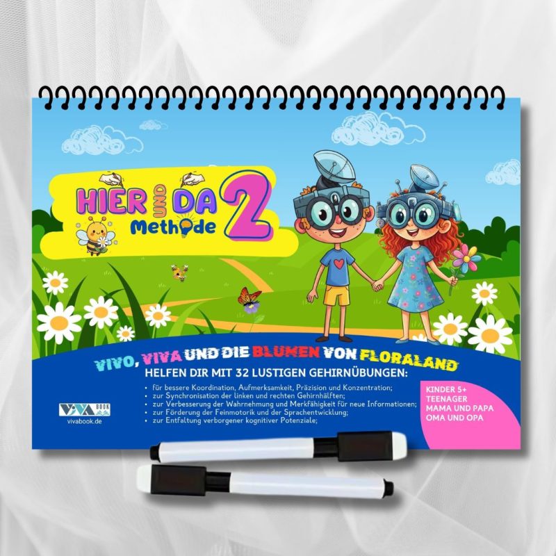 Die„Hier-und-Da-Methode 2“ ist kein Buch, das man nach einmaligem Gebrauch wegwirft. Die Seiten sind mit einer speziellen Laminierung versehen, und im Set erhalten Sie 2 abwischbare Marker. Groß und Klein zeichnen, wischen ab und probieren es immer wieder, bis sie das perfekte Ergebnis erzielen!