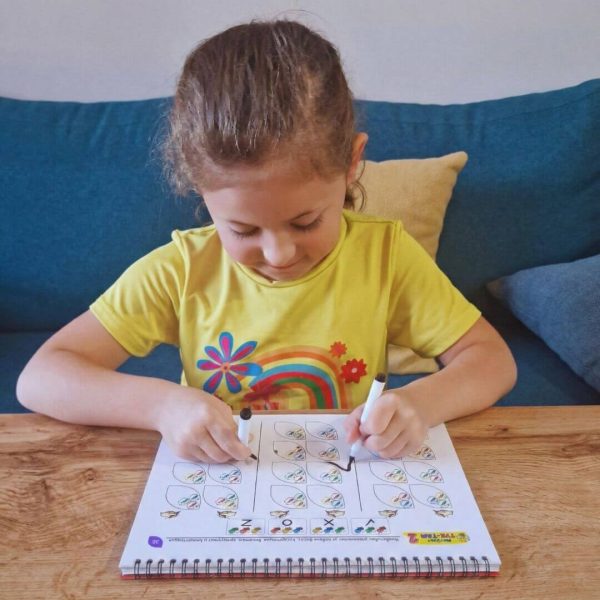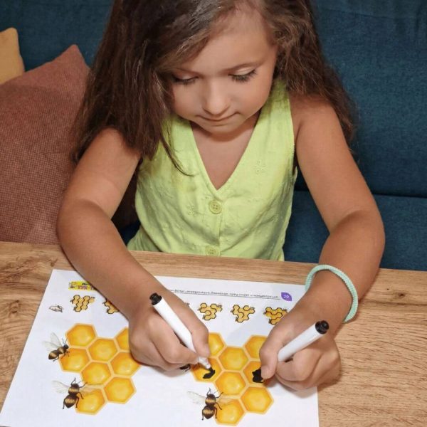 Die Aufgaben erfordern das Nachspuren von Linien, das Lösen logischer Verbindungen (zum Beispiel: Welche Biene gehört in welchen Bienenstock?) und das Zeichnen spiegelbildlicher Formen mit beiden Händen gleichzeitig. Das ist ein intensives Training für Feinmotorik, Detailgenauigkeit und logisches Denken. Die Methode ist besonders wertvoll bei ADHS (Aufmerksamkeitsdefizit-/Hyperaktivitätsstörung), Impulsivität, Legasthenie – das Buch ist in ADYS-Schrift gestaltet – und bei Schwierigkeiten mit der Aufnahme neuer Informationen.